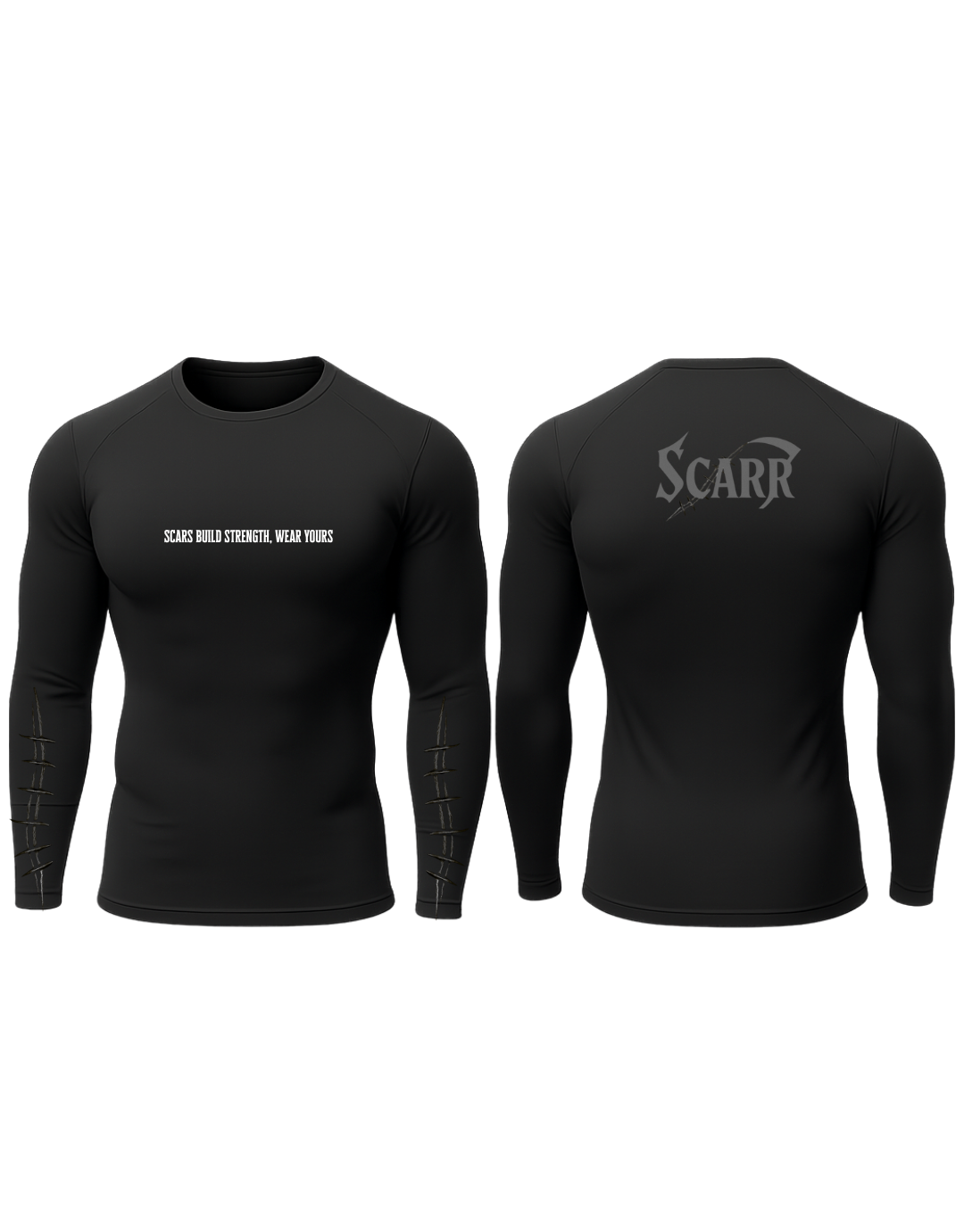 Na parte frontal, a frase “Scars build strength. Wear yours.” carrega o espírito da Scarr — lembrar que cada marca é prova de superação. Nas mangas, o detalhe das costuras estilizadas reforça o visual único, enquanto o logo discreto nas costas garante presença sem exageros.